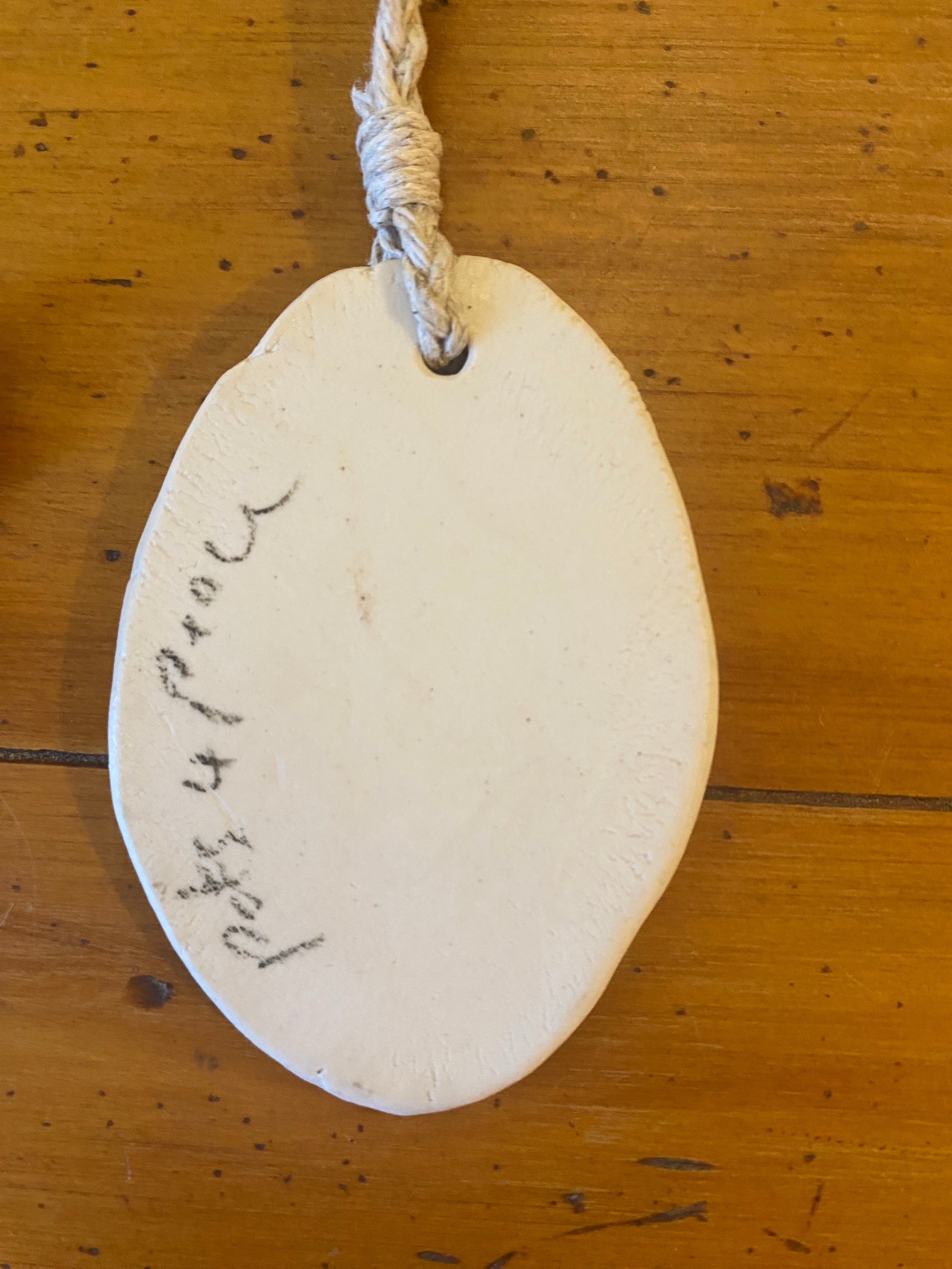 Drop necklace, handmade by me using white clay and featuring beautiful green crackle glaze that enhances the koru print. Natural hemp platted cord with wooden bead closure, each measuring 30cm. Length can be shortened by moving the bead.
