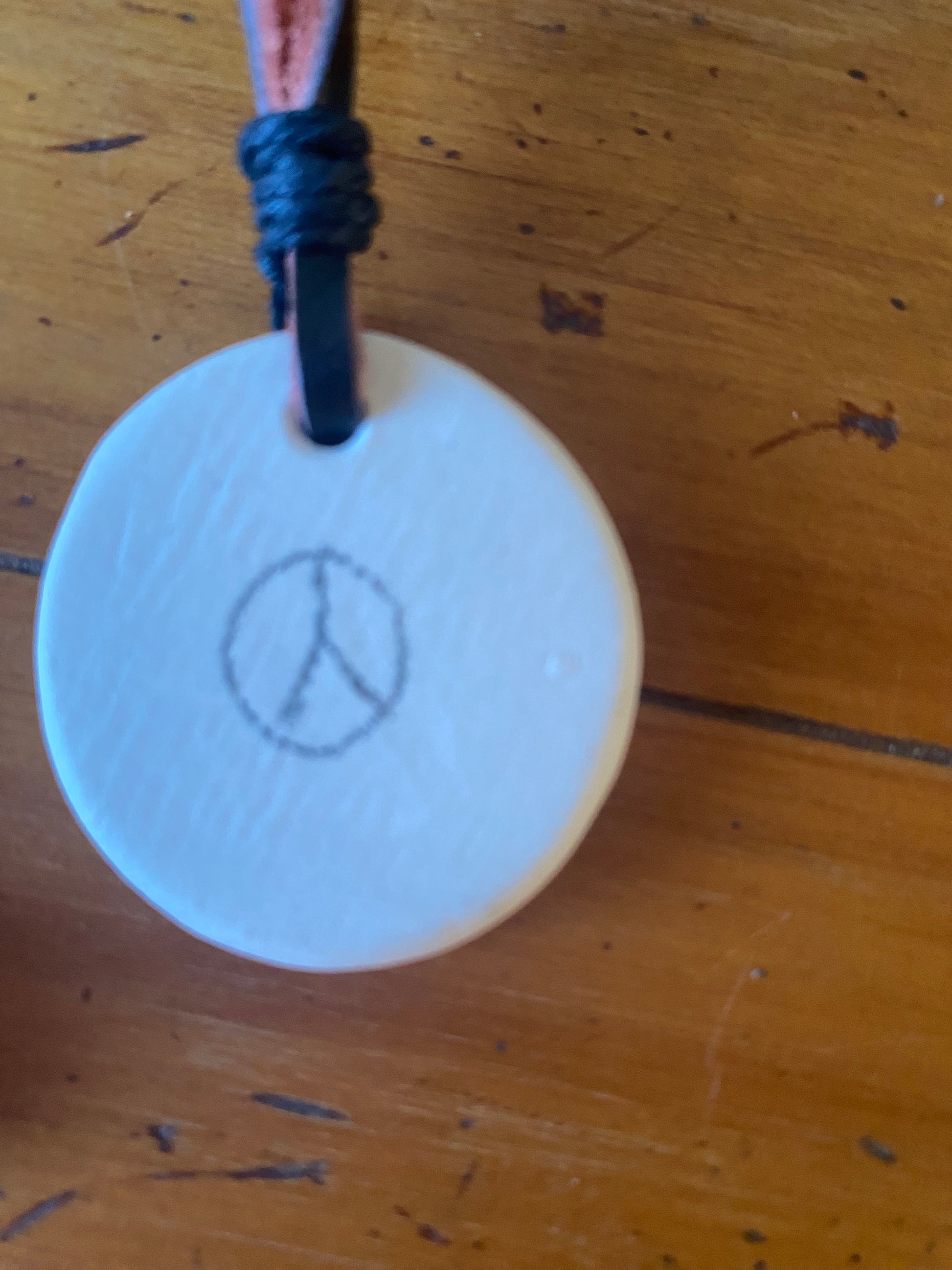 Drop necklace, handmade by me using white clay and featuring beautiful green crackle glaze that enhances the spiral print. Natural leather cord with wooden bead closure, each measuring 26cm. Length can be shortened by moving the bead.