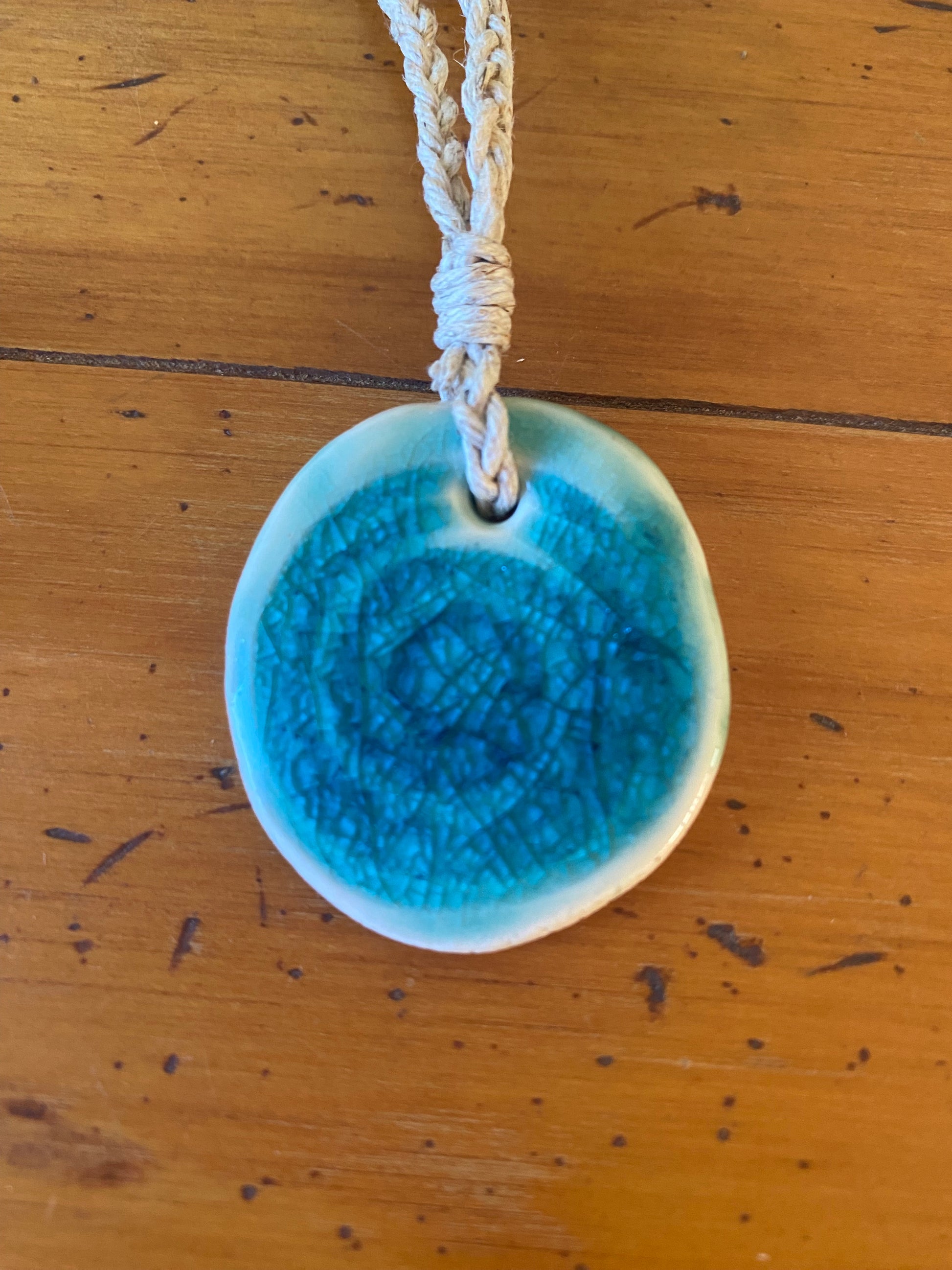 Drop necklace, handmade by me using white clay and featuring beautiful green crackle glaze that enhances the spiral print. Natural hemp cord platted with wooden bead closure, each measuring 23cm. Length can be shortened by moving the bead.